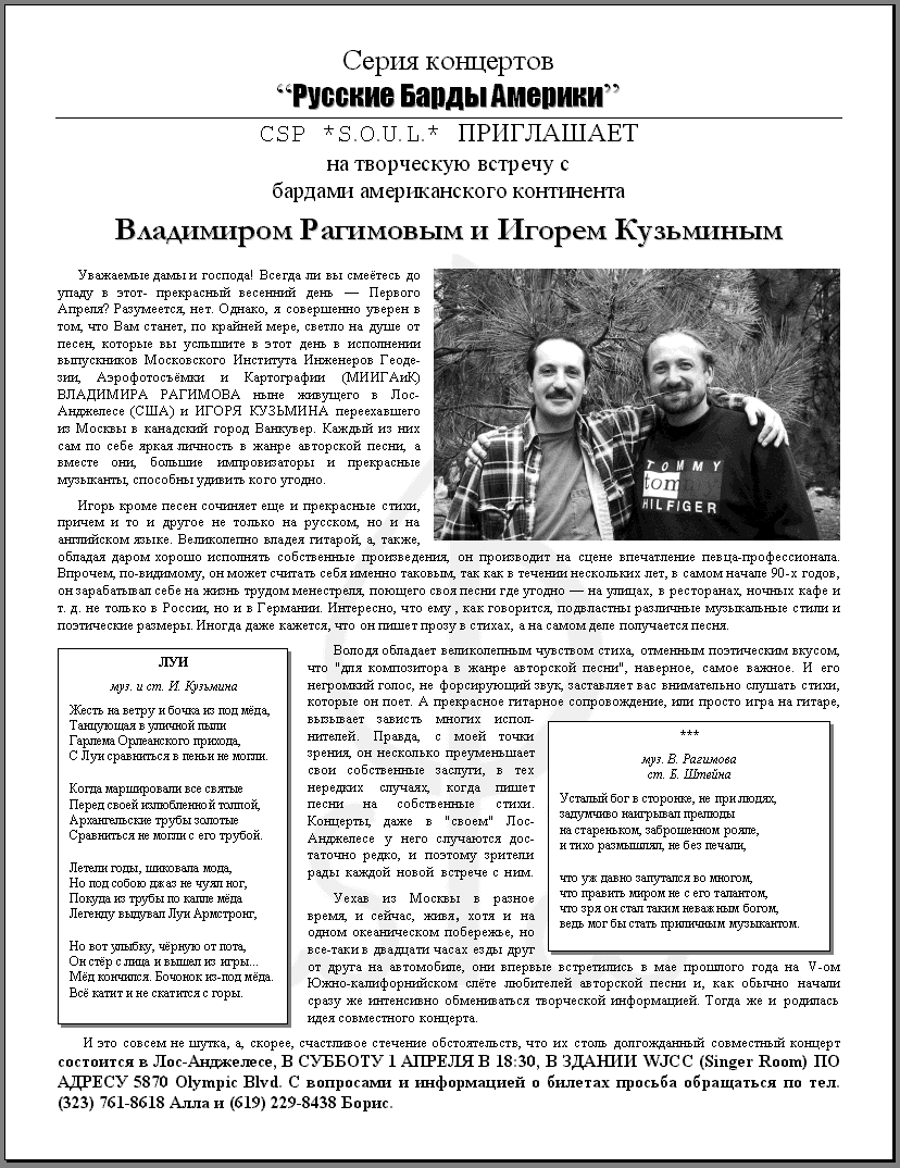 Игорь кроме песен сочиняет еще и прекрасные стихи, причем и то и другое не только на русском, но и на английском языке. Великолепно владея гитарой, а, также, обладая даром хорошо исполнять собственные произведения, он производит на сцене впечатление певца-профессионала. Впрочем, по-видимому, он может считать себя именно таковым, так как в течении нескольких лет, в самом начале 90-х годов, он зарабатывал себе на жизнь трудом менестреля, поющего свои песни где угодно - на улицах, в ресторанах, ночных кафе и т. д. не только в России, но и в Германии. Интересно, что ему , как говорится, подвластны различные музыкальные стили и поэтические размеры. Иногда даже кажется, что он пишет прозу в стихах, а на самом деле получается песня. Володя обладает великолепным чувством стиха, отменным поэтическим вкусом, что "для композитора в жанре авторской песни", наверное, самое важное. И его негромкий голос, не форсирующий звук, заставляет вас внимательно слушать стихи, которые он поет. А прекрасное гитарное сопровождение, или просто игра на гитаре, вызывает зависть многих исполнителей. Правда, с моей точки зрения, он несколько преуменьшает свои собственные заслуги, в тех нередких случаях, когда пишет песни на собственные стихи. Концерты, даже в "своем" Лос-Анджелесе у него случаются достаточно редко, и поэтому зрители рады каждой новой встрече с ним. Уехав из Москвы в разное время, и сейчас, живя, хотя и на одном океаническом побережье, но все-таки в двадцати часах езды друг от друга на автомобиле, они впервые встретились в мае прошлого года на V-ом Южно-калифорнийском слете любителей авторской песни и, как обычно начали сразу же интенсивно обмениваться творческой информацией. Тогда же и родилась идея совместного концерта. И это совсем не шутка, а, скорее, счастливое стечение обстоятельств, что их столь долгожданный совместный концерт состоится в Лос-Анджелесе, В СУББОТУ 1 АПРЕЛЯ В 18:30, В ЗДАНИИ WJCC (Singer Room) ПО АДРЕСУ 5870 Olympic Blvd. С вопросами и информацией о билетах просьба обращаться по тел. (323) 761-8618 Алла и (619) 229-8438 Борис. |